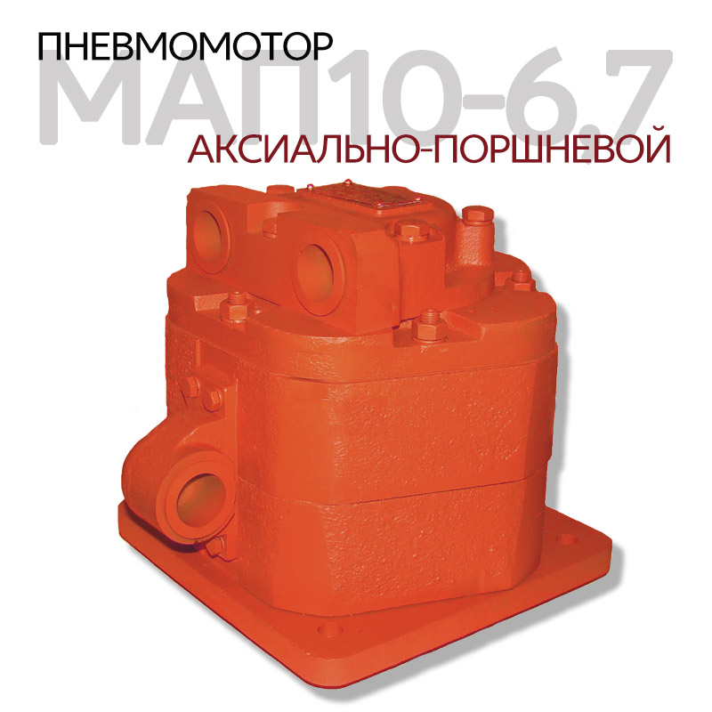 Пневмомотор аксиально-поршневой МАП10-6,7– реверсивный, нерегулируемый, с пятью двусторонними поршнями, с профильным диском многократного действия, предназначен для привода шахтных погрузочных и погрузочно-транспортных машин, бурильных установок, проходческих вагонов, лебедок и других агрегатов и механизмов. Пневмомотор рассчитан на эксплуатацию при температуре окружающей среды от -5С до +50С и относительной влажности воздуха до 97% при +35С.