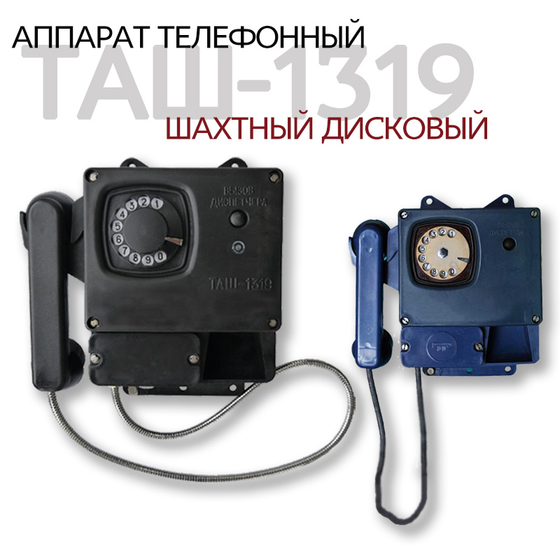 Шахтные телефоны с дисковым номеронабирателем ТАШ-1319 предназначены для установки в шахтах (карьерах, открытых площадках), опасных по газу (рудничный метан) и горючей пыли в комплекте с аппаратурой автоматической шахтой связи "Диск-ШАТС", КДШМ, а также аппаратурой ДКСГ-1В (ШАТС-3 и ИГАС-3) с приставкой УРИ совместно с автоматическими станциями УАТС-49, УАТСК-100/2000, УПАТС-100/400.